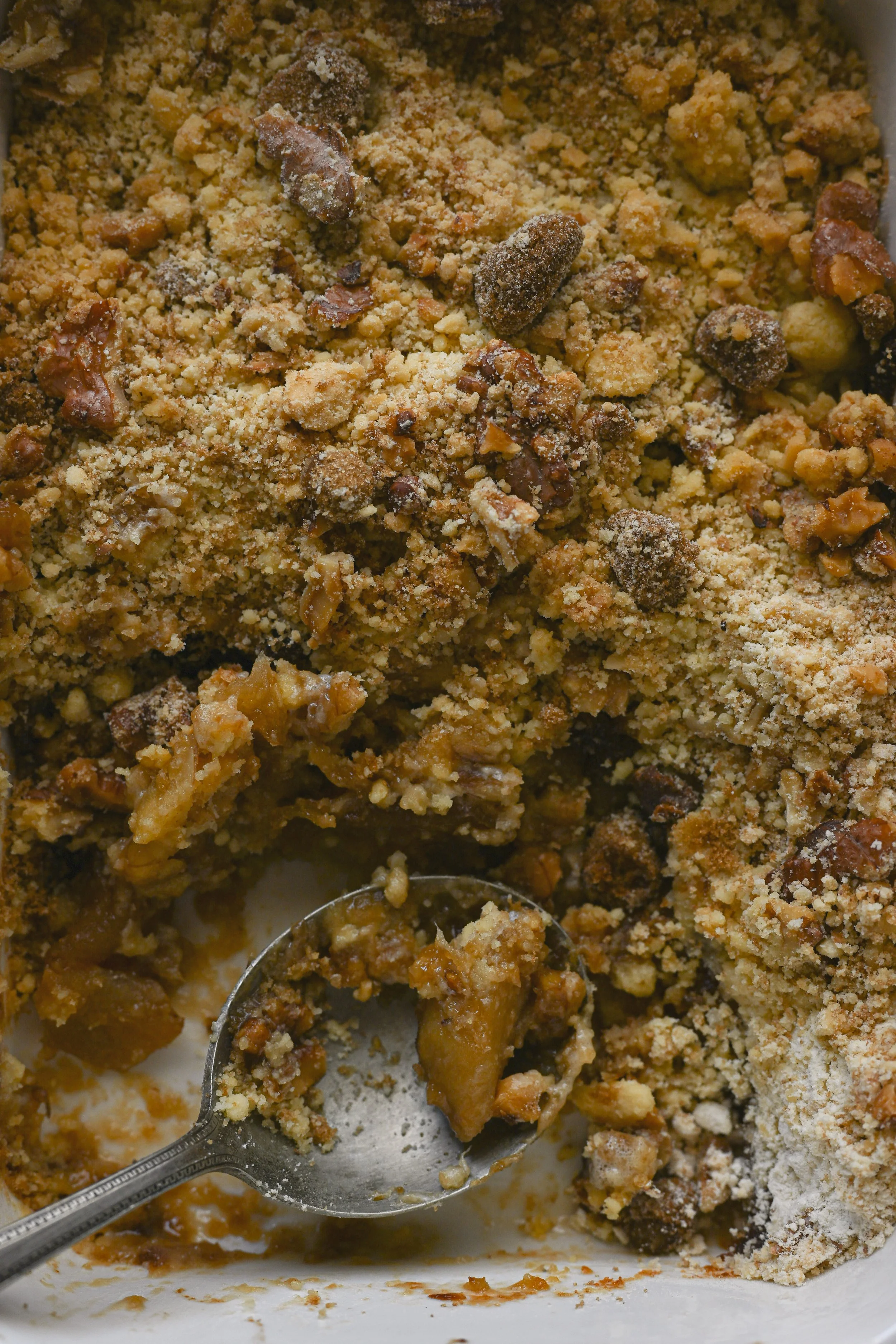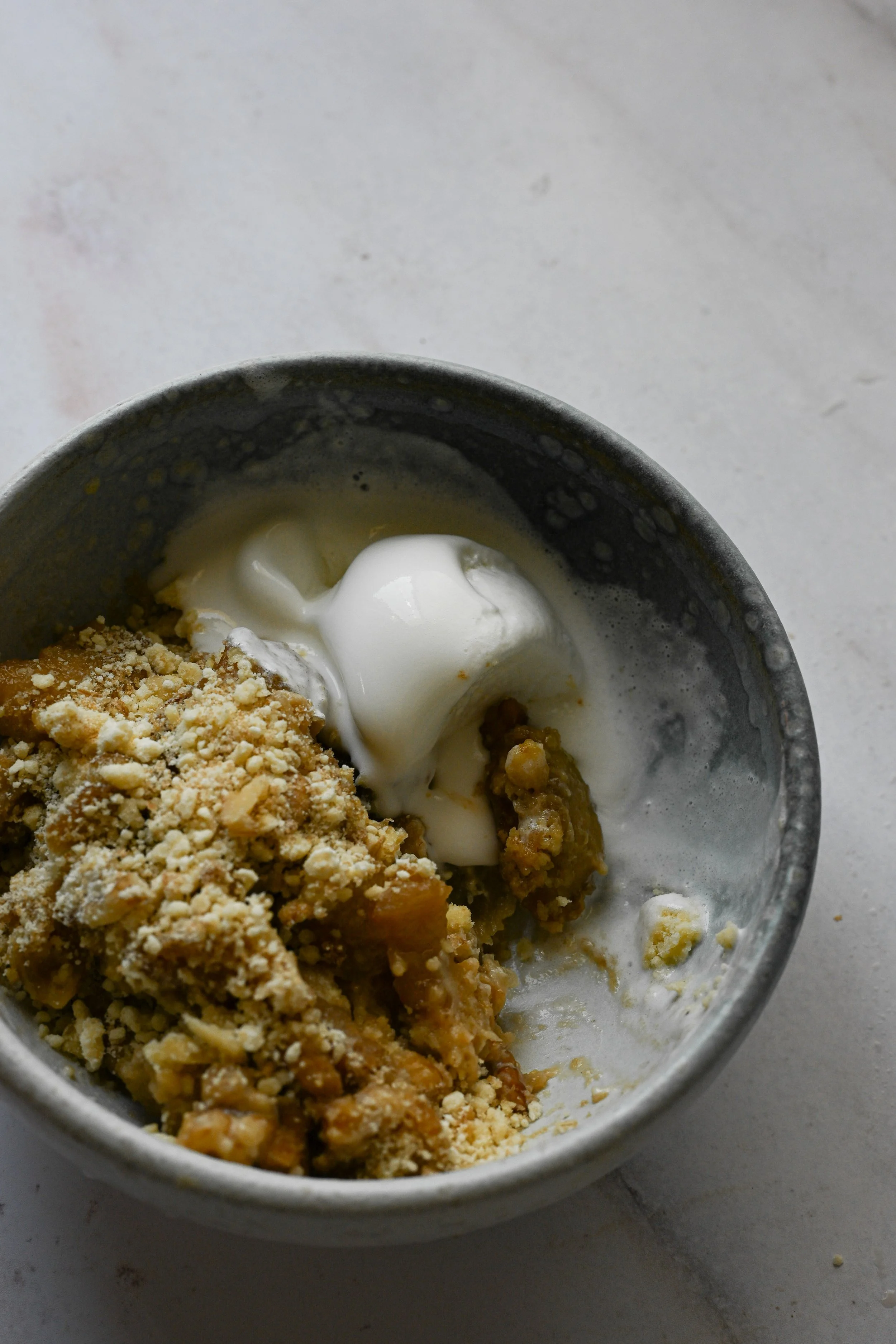 Spread the apples in a small casserole dish in a single layer. Scatter the cold crumble on top. Bake for 25 minutes, or until the topping turns golden brown.