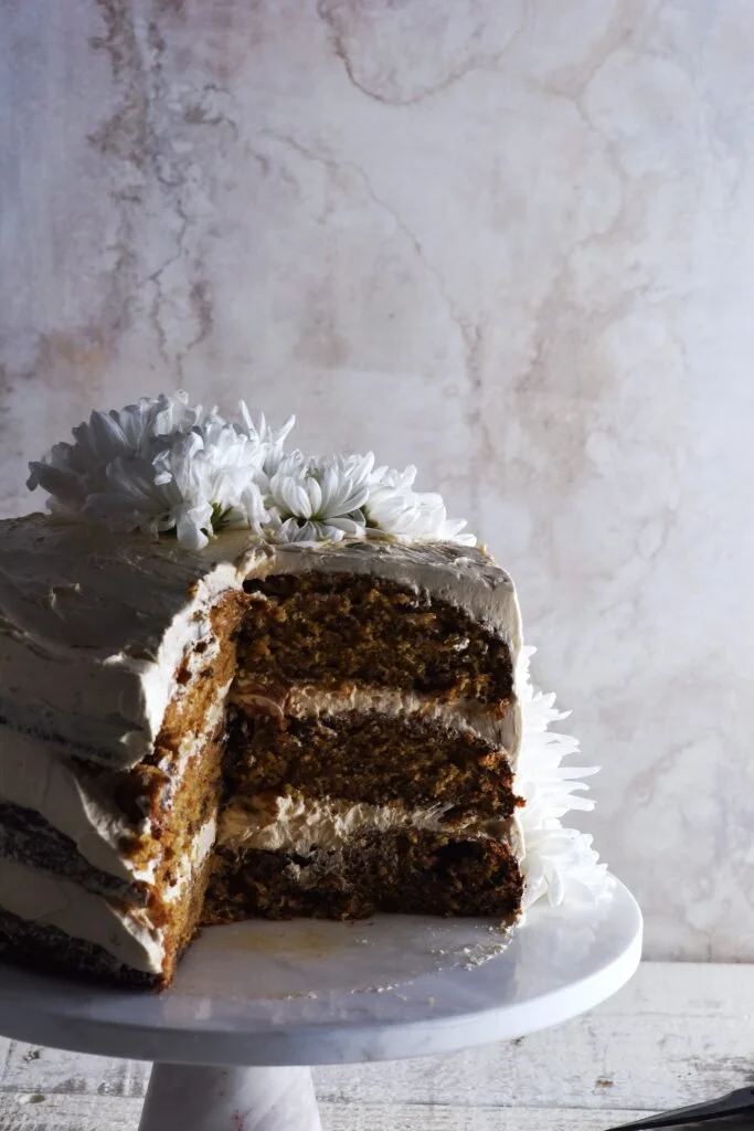 Date tahini toffee cake with salted tahini Swiss meringue buttercream