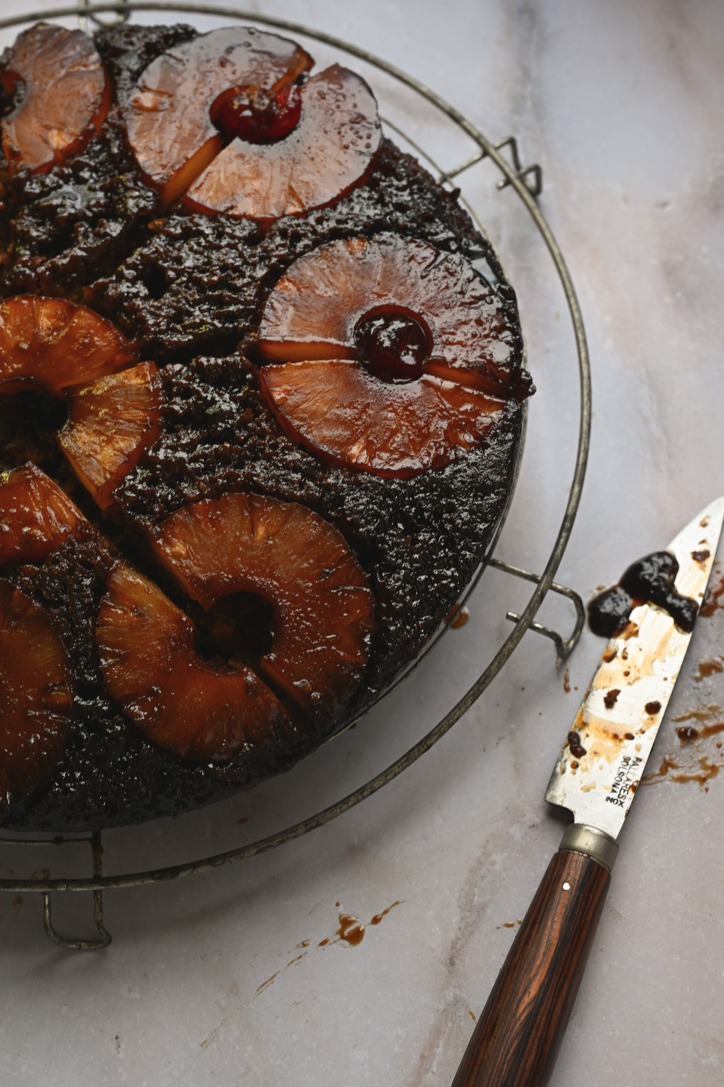 I don’t make pineapple upside-down cake often, but when I do, I want it darker and more grounded — molasses-heavy, gently spiced, and not overly sweet. This version leans into gingerbread: fresh ginger, cardamom, orange zest, and just enough cocoa to deepen everything without turning it into a chocolate cake.