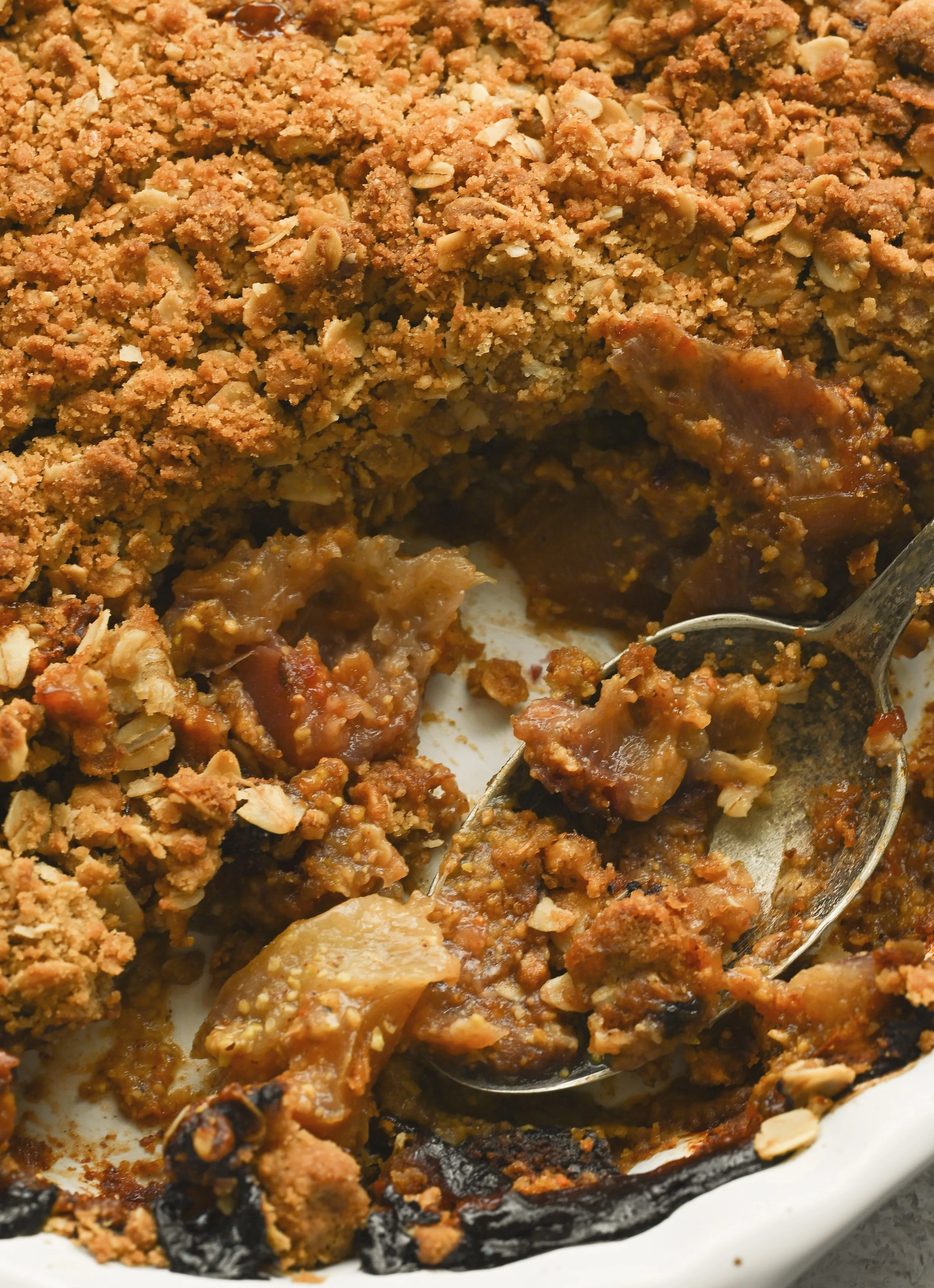 I’ve always adored that simple pairing — fresh bread, salted butter, a generous swipe of fig jam. It’s the kind of flavour that’s both humble and luxurious, sweet but grounded, comforting yet alive with contrast. So I wanted to turn that joy into a warm dessert: a bubbling fig crisp, the fruit baked until jammy beneath a golden, oat-strewn topping. I use salted butter instead of unsalted — I love how the faint savoury edge plays against the deep sweetness of the figs.
