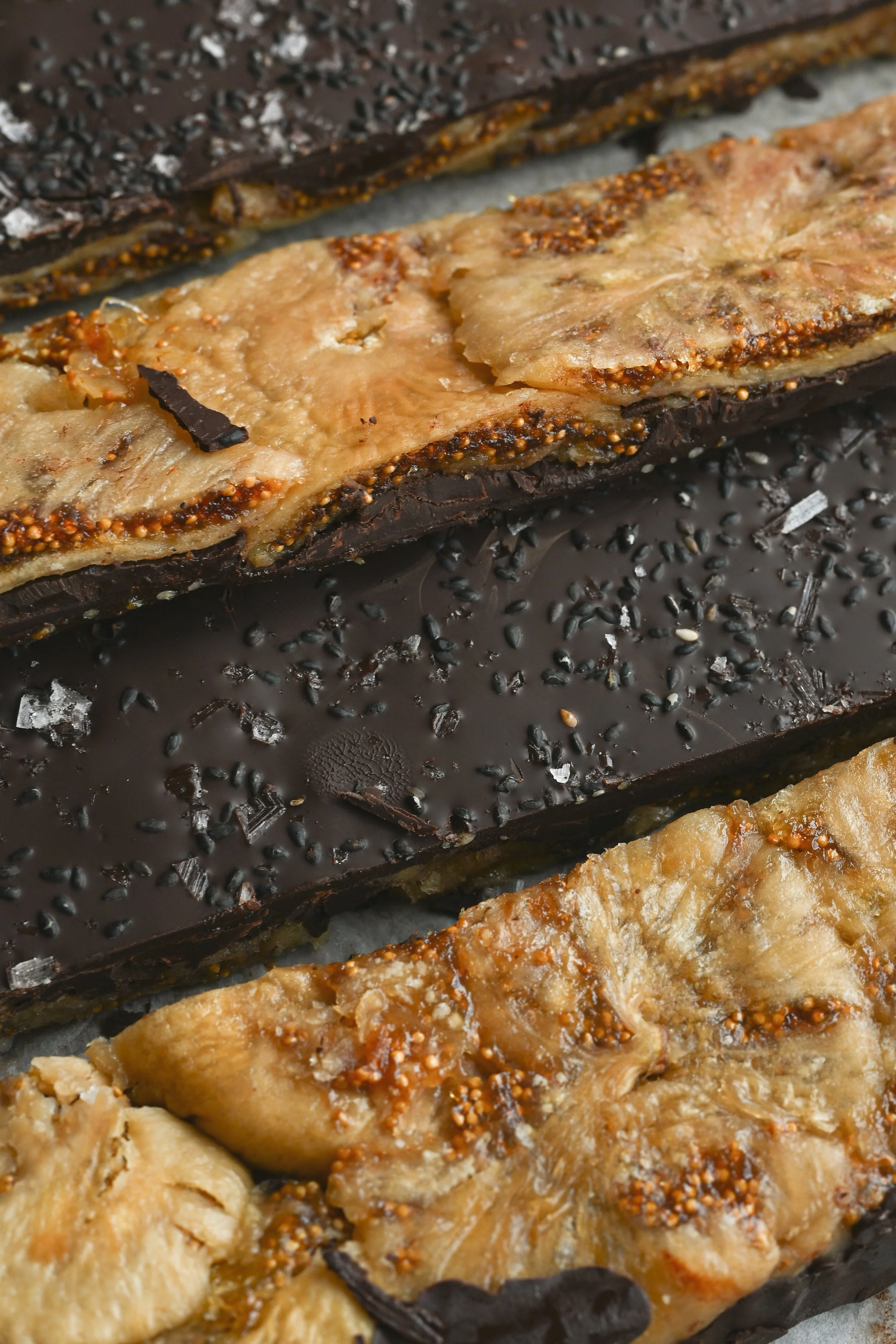 Melt the dark chocolate and pour it over the figs, spreading it gently to cover. Finish with a sprinkle of sea salt, sesame seeds, or whatever seeds you have on hand.