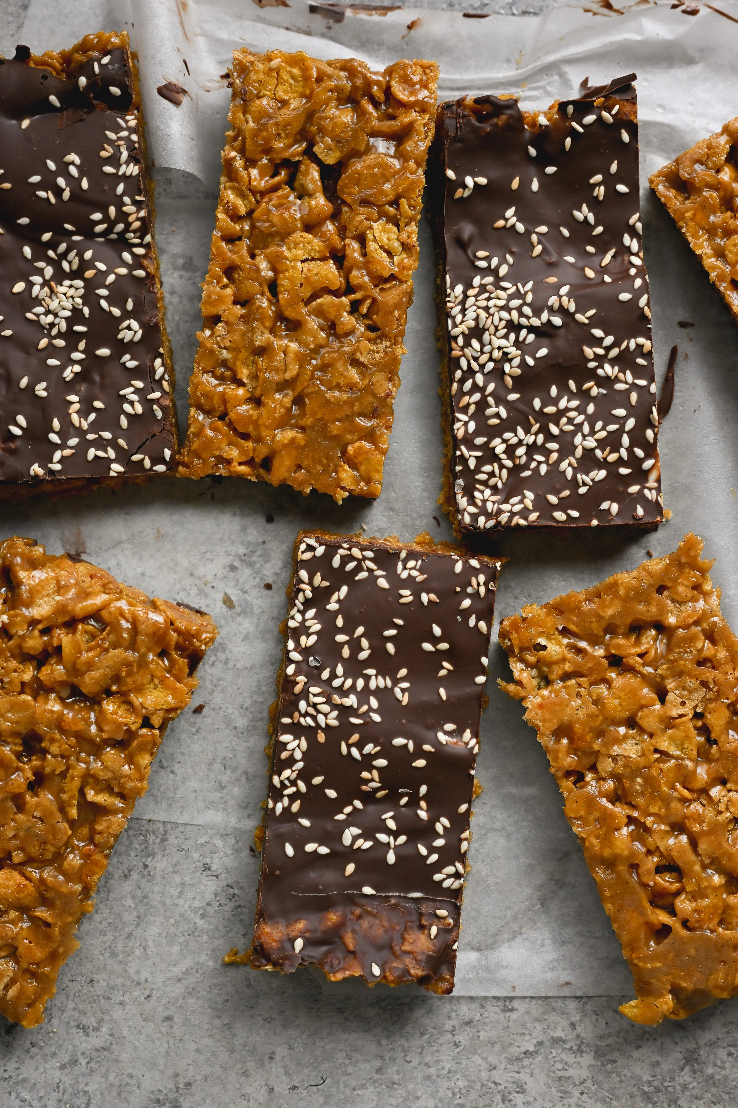 Pour over the pressed cornflake layer and spread evenly. Sprinkle with sesame seeds or flaky sea salt, if desired.